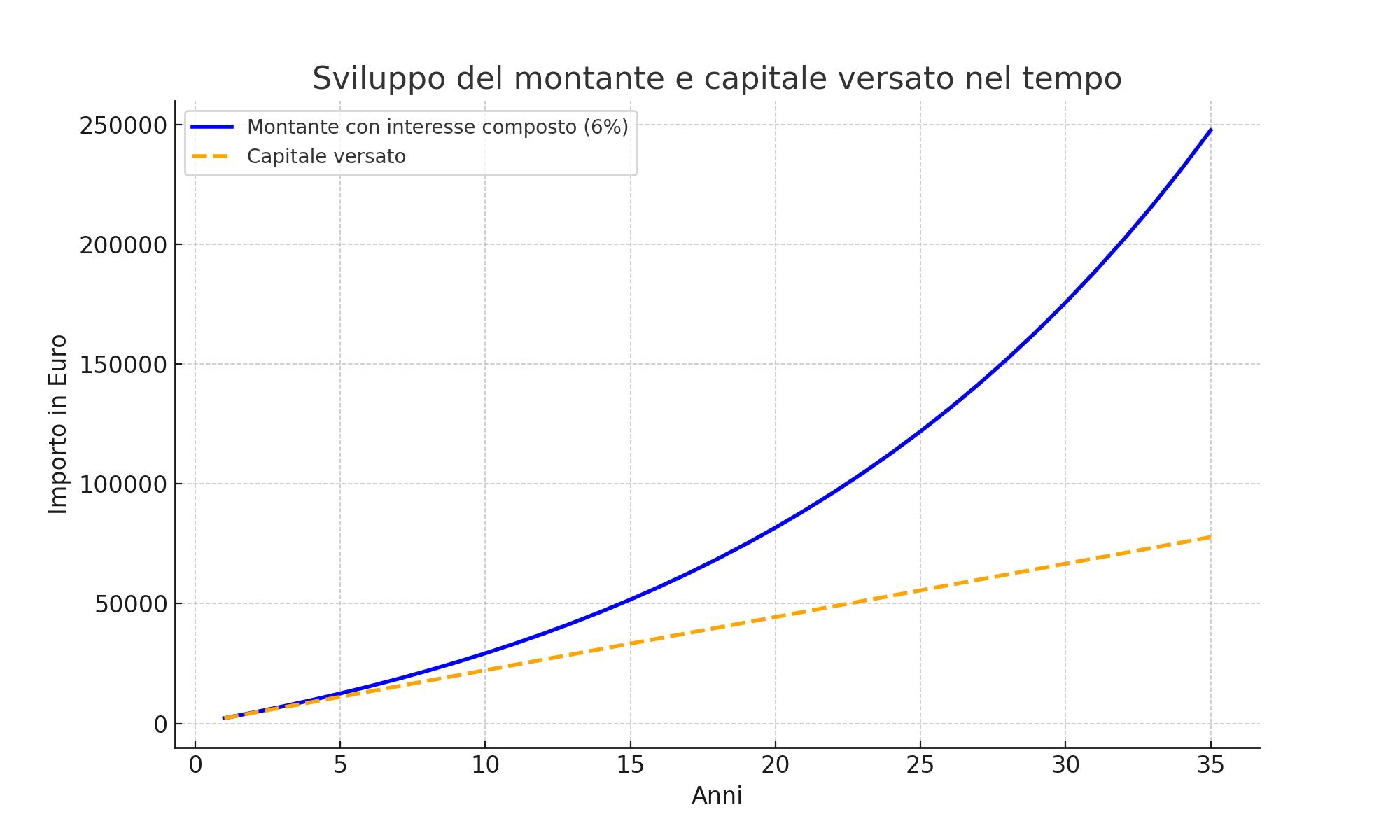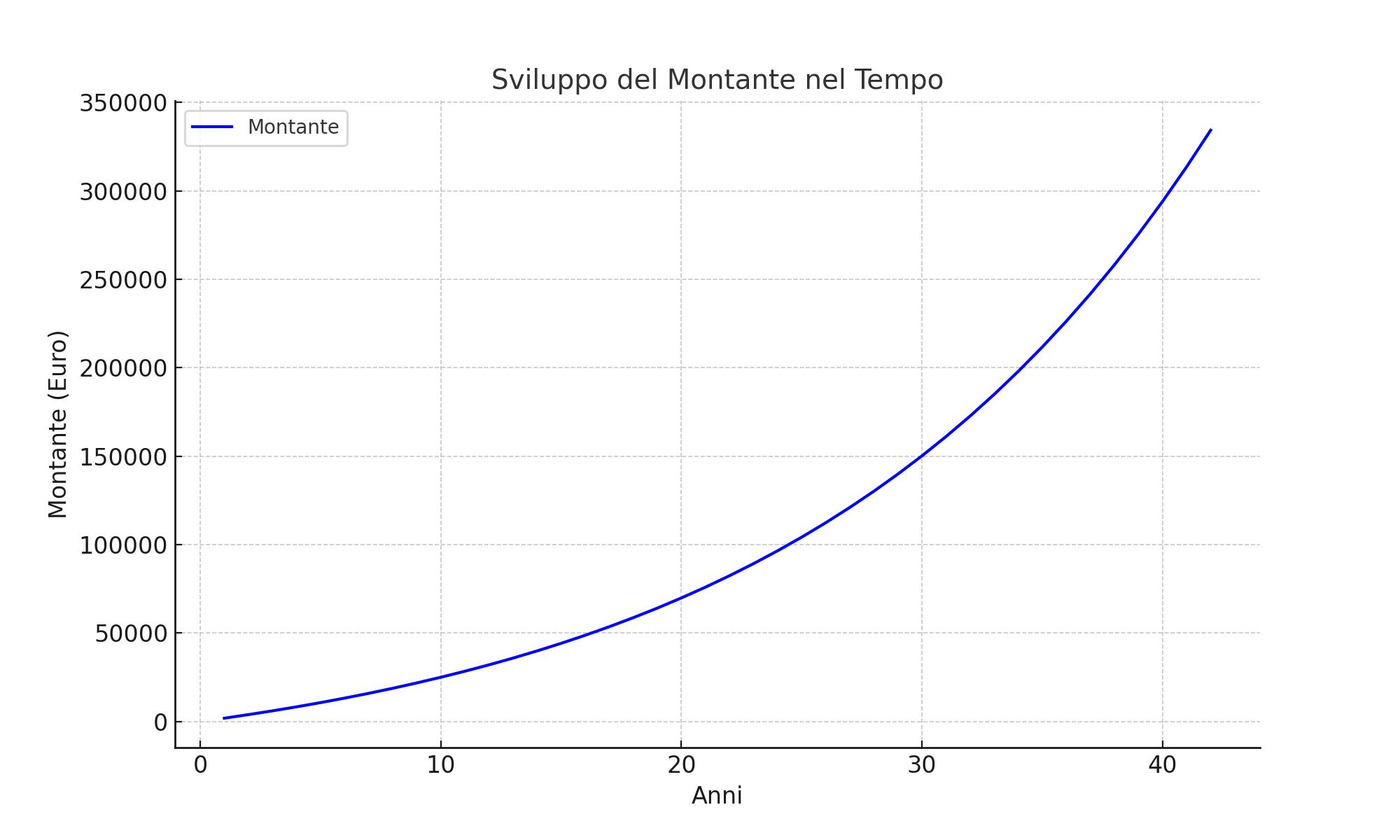 Se osservi il grafico, noterai che la curva del montante parte lenta: all’inizio lo scarto rispetto al capitale è minimo. Con il passare del tempo però la curva si impenna. È l’effetto tipico dell’interesse composto, che trasforma una crescita lineare in una crescita esponenziale.