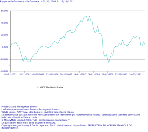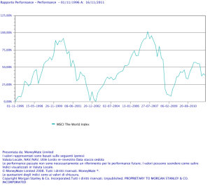 Ovviamente, per un giovane baldanzoso come me che si stava apprestando a svolgere l’attività del consulente finanziario, ben presto il libro sostituì la bibbia sul comodino. Sembrava tutto così semplice guardando il passato, sarebbe stato sufficiente mantenere un holding period di 5 anni per avere un 75% di probabilità di battere il BOT e qualora fosse andata male su un orizzonte di 5 anni (il che sarebbe stato assai improbabile) sarebbe stato sufficiente allungare il periodo di detenzione del portafoglio azionario a 10-15 anni per avere la quasi certezza statisica di ritorni non solo ampliamente superiori ai bot ma addirittura superiori a qualsiasi attività finanziaria e reale. Così, oggi, sono andato a fare delle verifiche sugli indici per capire se anche su orizzonti lunghi il mercato azionario mondiale a pagato il risparmiatore per il rischio corso anche in questi ultimi anni. Allo stato attuale, come appare dai grafici qui sotto esposti, il World index in valuta locale ha dato i seguenti risultati: