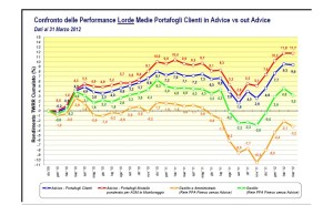 Il grafico illustra i rendimenti medi cumulati ottenuti da dicembre 2009 al 31 marzo 2012 dei portafogli clienti sotto contratto di consulenza e dei portafogli fai da te. In particolare i portafogli costruiti in consulenza ovvero con il servizio di fee annua pagata al broker e promotore per la costruzione del portafoglio ed il monitoraggio nel tempo dello stesso hanno generato mediamente molto più rendimento e minore rischio dei portafogli non messi sotto consulenza. Un altro aspetto molto importante è che la peggiore performance è stata generata dai portafogli di amministrato e gestito (fondi, etf) non in consulenza. Là risiedono anche coloro i quali comprano e vendono azioni, obbligazioni e tutti gli altri strumenti non gestiti professionalmente . L’evidenza empirica non sembra giocare a favore del fai da te anche in Italia.