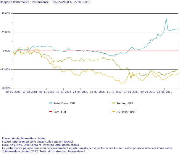 Durante varie visite in queste settimane ho affrontato la preoccupazione degli investitori sulle sorti della Grecia. Ciò non tanto per il forte interesse verso una nazione dell’unione europea che sta andando a picco quanto per la paura di dover affrontare una situazione simile anche in Italia, dover ritornare alla Lira, oppure dover affrontare una fase estremamente recessiva per diversi anni nella zona euro. Ma cosa si potrebbe fare per proteggersi da uno scenario di questo tipo ? Sicuramente diversificare……e qui non c’è nulla di nuovo rispetto a ciò che scrivo sempre nei miei articoli ma una diversificazione che comprenda una parte del portafoglio in valute forti quali il dollaro, l’Euro, la Sterlina ed il franco svizzero. Sicuramente, in uno scenario che metta in discussione l’esistenza dell’euro o della presenza del nostro paese all’interno dell’unione monetaria, avere nel portafoglio valute rifugio si rivelerebbe una buona cosa. Ma diamo una occhiata alle quattro valute menzionate ed al loro andamento dal 2000 ad oggi. Naturalmente confronteremo tutto contro euro.