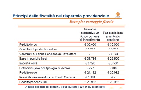 Incentivi ancora più pesanti vista la riduzione della detraibilità introdotta dal governo letta per le polizze vita.  Il governo ha infatti deciso con il decreto,  di abbassare notevolmente la soglia di detraibilità del premio. E così, per il periodo di imposta 2013 il massimale, prima di 1.291 euro, scenderà a 630 euro per poi calare ancora, a partire dal 1° gennaio, a quota 530 euro. Vorrei, questa volta, essere particolarmente pratico. Facciamo l’esempio di due lavoratori ipotetici chiamati Giovanni e Paolo che hanno un reddito lordo di 35.000 euro. Il primo , Giovanni, decide di non aderire ad un fondo pensione e di destinare una parte del reddito netto disponibile ad un fondo comune mentre il secondo, Paolo, decide di aderire ad un fondo pensione. Ovviamente tutto ciò a parità di reddito lordo e di reddito per consumi in modo da rendere omogenii i dati e quindi comparabili.