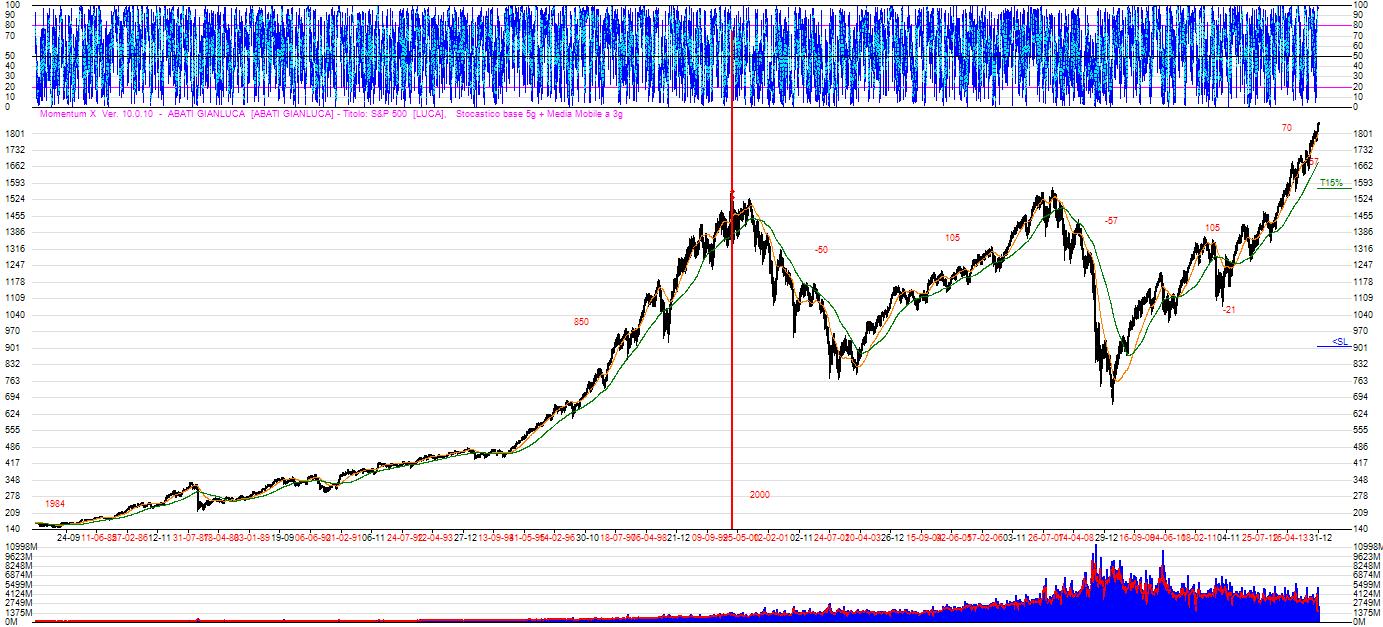 Qui sotto possiamo vedere l’andamento dello S&P500 dal 1984 e capire come il sistema funziona nel momento in cui il mercato inverte il trend e diventa ribassista per un certo periodo di tempo. In rosso potrete vedere le percentuali di rialzo dai minimi e ribasso dai massimi nonchè la durata dei trend. Dal 1984 si possono contare 5 trend primari di medio periodo. Tre rialzisti e due ribassisti. Lasciamo a qualcun altro l’onere di fare previsioni !