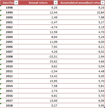 Come ho già detto il fondo è partito nel 1998 e immagino siate curiosi di vedere quale è stato il risultato annuale e annualizzato cumulato. Per cui andiamo a vedere la tabella