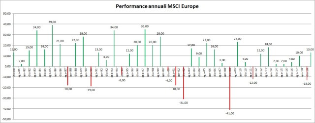 Qualche giorno fa il Sole24ore ha pubblicato su Plus24, inserto settimanale dedicato al risparmio, i rendimenti del mkt azionario Europeo ed americano dal 1980 ad oggi. Qui sotto potrete trovare i rendimenti nominali annui del mercato azionario europeo misurato dall’indice MSCI Europe degli ultimi 40 anni