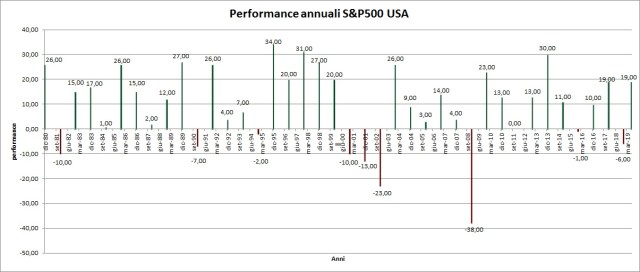 Pubblico anche i rendimenti annuali del mercato azionario USA degli ultimi 40 anni misurati dallo S&P500