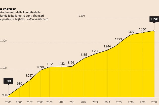 Che strano popolo gli Italiani, siamo da anni in grande crisi e ciò è rivelato dai dati Istat e più semplicemente parlando con la gente per strada, eppure, continuiamo a navigare in un mare di liquidità. Gli ultimi dati di Bankitalia evidenziano 1400 Mld di euro tra conti correnti, depositi e biglietti. E dal 2008 (fallimento Lehman Brothers) l’anno della grande crisi, questo mare di liquidità che quasi basterebbe ad estinguere in un sol colpo il grande debito Italiano, è aumentata di 300 Mld. Neanche la crisi ha arrestato il trend, nonostante negli ultimi anni sui mercati vi sia stato un clima internazionale più disteso.