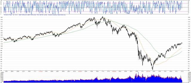 i momenti di incrocio delle medie arancione e verde e la loro grande utilità nel determinare il trend. Una cosa evidente, guardando l’indice mondiale, che è una costante dei mercati azionari globali, è la limitata durata delle fasi ribassiste e la maggiore durata delle fasi rialziste. Per brevi periodi si ripercorre all’indietro una parte del rialzo precedente. Anche in questo caso ancora l’incrocio delle due medie non è avvenuto dunque per chi ha una esposizione azionaria troppo alta si potrebbe penare di ridurla basandoci solo sulla media a 200 giorni e sperando che non sia un falso segnale…a presto..