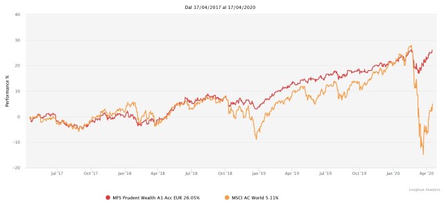 Il confronto di questo fondo va fatto con un indice azionario internazionale quale il MSCI World all country poichè le aziende che il gestore compra sono internazionali. E dunque facciamolo relativamente agli ultimi 3 e 5 anni.